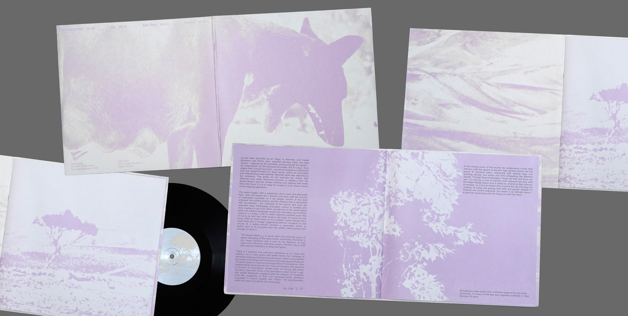 Là is an immersive, politically charged sound journey – a lament for the Al Naqab desert in Palestine. It is the result of a collaboration between Sirah Foighel Brutmann, Eitan Efrat, Laszlo Umbreit, and Ot Lemmens. The album combines acoustic instruments like flute and cymbals with processed electronics and mechanical sounds.